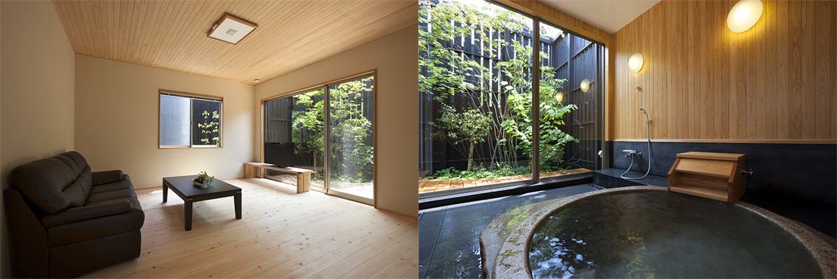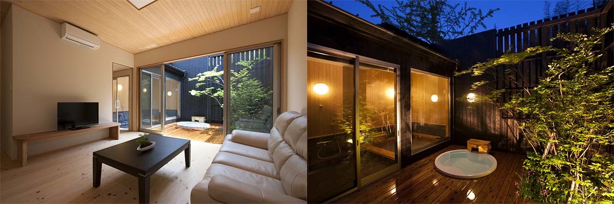 [ - hanare - 離れ ] 吉(よし)、○(えん)、芭(はな)、天(そら)、実(みのり)、樹(いつき)とタイプが違う6棟の離れをご用意しております。それぞれがプライベートな空間ですので、人目を気にせずご家族やグループでゆったりとお寛ぎ頂けます。 吉(よし)、○(えん)はテラスを解放し繋げることが可能ですので、2棟での大家族・グループのご利用もできます。 吉(よし) ○(えん) 芭(はな) 天(そら) 実(みのり) 樹(いつき) アメニティ シャンプー、リンス、ボディーソープ、ティッシュ、綿棒、 ドライヤー温泉水をご用意しております。※有料(カミソリ、歯ブラシ、タオル、バスタオル)
