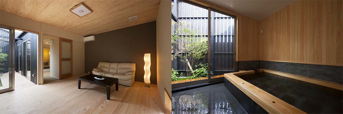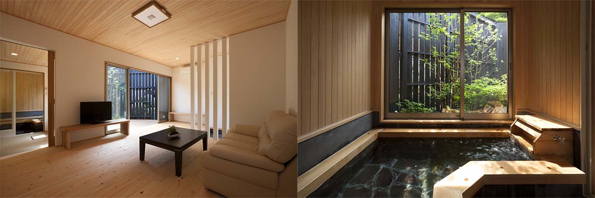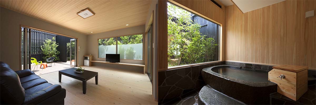 [ - hanare - 離れ ] 吉(よし)、○(えん)、芭(はな)、天(そら)、実(みのり)、樹(いつき)とタイプが違う6棟の離れをご用意しております。それぞれがプライベートな空間ですので、人目を気にせずご家族やグループでゆったりとお寛ぎ頂けます。 吉(よし)、○(えん)はテラスを解放し繋げることが可能ですので、2棟での大家族・グループのご利用もできます。 吉(よし) ○(えん) 芭(はな) 天(そら) 実(みのり) 樹(いつき) アメニティ シャンプー、リンス、ボディーソープ、ティッシュ、綿棒、 ドライヤー温泉水をご用意しております。※有料(カミソリ、歯ブラシ、タオル、バスタオル)